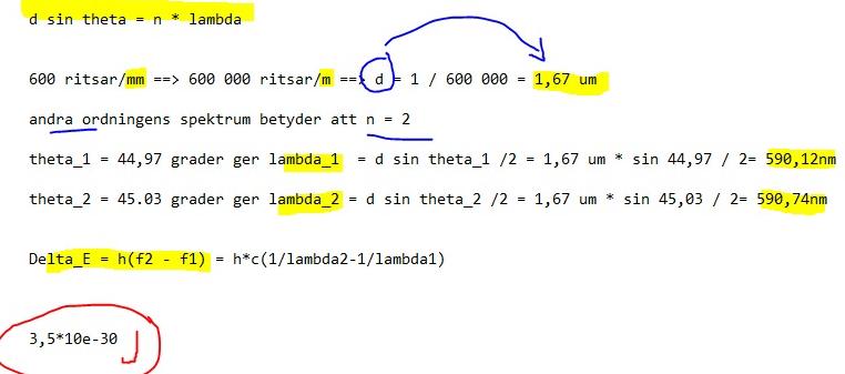 Och i den här uppgiften ser man att vinkeln i uppspaltningen är typ 103 gånger mindre än diffraktionsvinkeln.