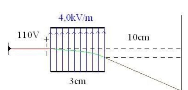 En proton accelereras med spänningen 110 V och passerar därefter genom ett elektriskt fält med fältstyrkan 4,0 kV/m enligt bilden nedan. Fältets längd är 3,0 cm. Bortse från gravitationella krafter i uppgiften. Hur stor sträcka har protonen avlänkats då den lämnarfältet?