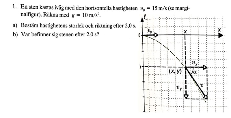 Ditt svar på b-uppgiften är rätt, men inte det på a-uppgiften. Du har endast beräknat hastigheten i y-led, men stenen har även en hastighet i x-led.