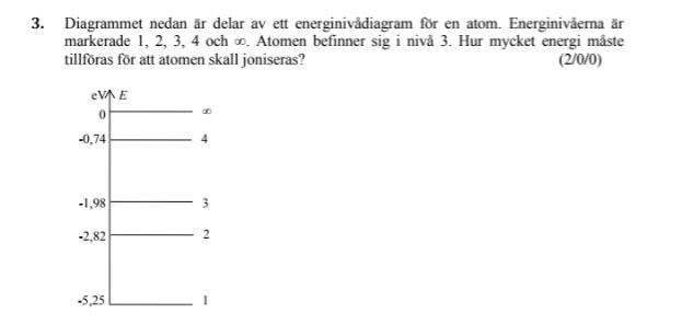 Nej, du skall bara beräkna energiskillnaden mellan nivå 3 och nivå oändligt, d v s 0 - (-1,98).