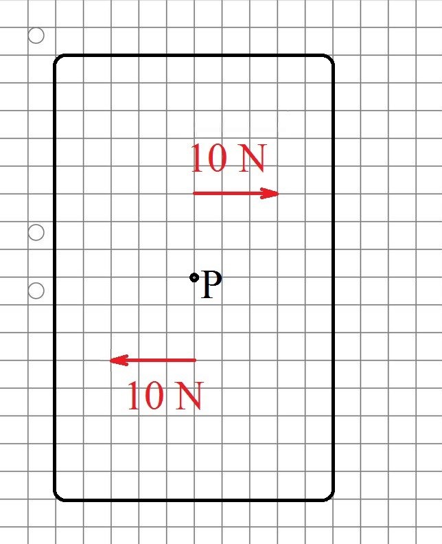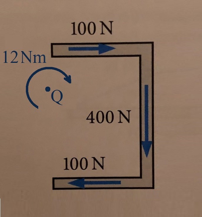 De två krafterna på vardera bildar ett medurs kraftpar (annars kallat rent moment) med storlek som är verksamt överallt (där Q är någon valfri punkt):