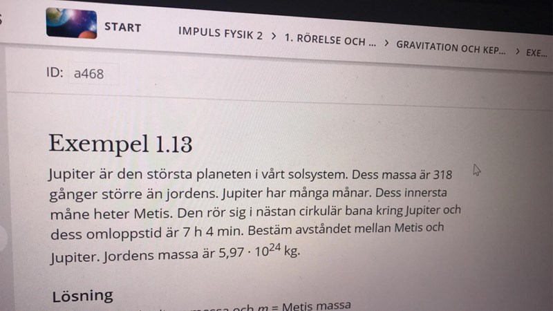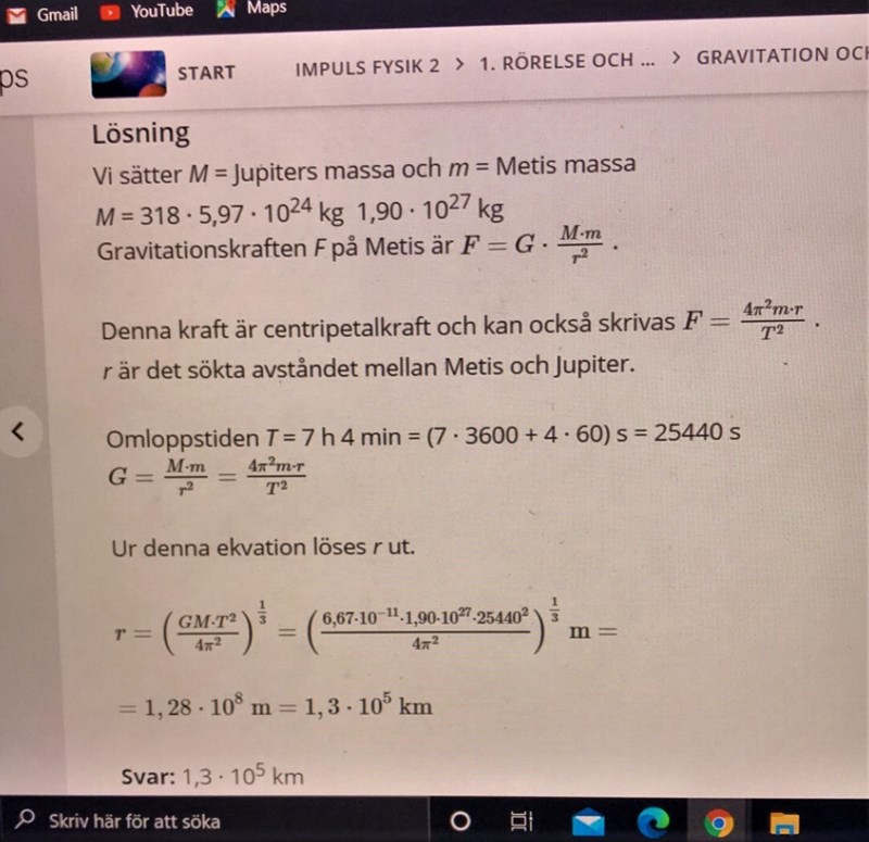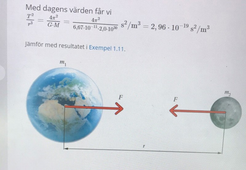 här har jag hittat en mycket lik uppgift men vart har dom tagit Jupiters månes massa ifrån? Står på andra bilden M=318 · 5,97 · 1024 kg sedan antar jag att det ska stå m=1,90 · 1027 kg men vart kommer detta ifrån, är det något dom kollat upp. sedan är r utlöst så det är den formeln jag ska använda? och är lite osäker på hur jag räknar ut T. 3600 och 60 vad är det för mått? Efter jag fått hjälp med detta borde det inte vara några problem att räkna ut.