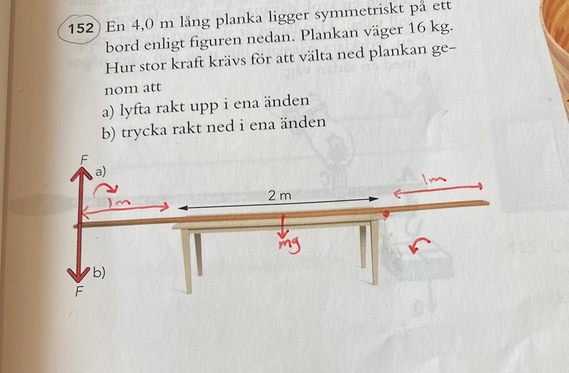 När man sätter momentpunkten i bordets högra ände blir momentarmen 3 m eftersom det är 3 m till där kraften appliceras. Om du lyfter plankan till vänster så rör sig plankan medurs runt momentpunkten till höger.