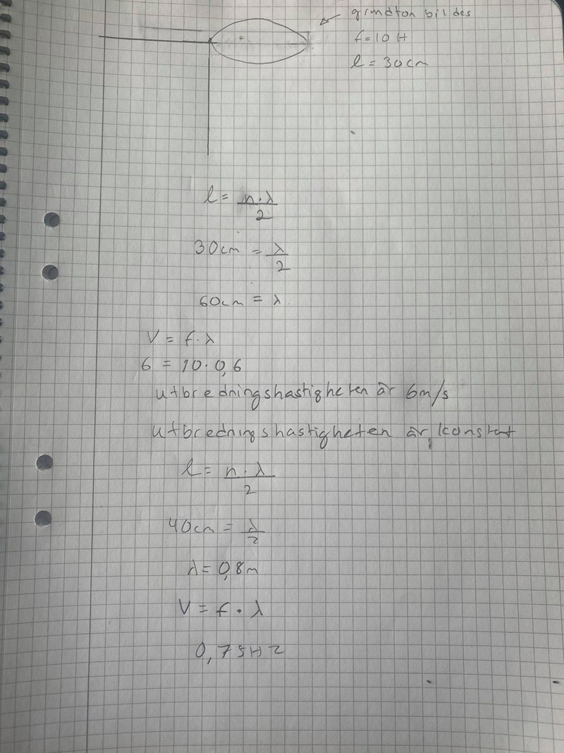 Ena änden av en 30 cm lång linjal av plast spänns fast i ett bord. Man slår till den fria änden av linjalen som får svänga fritt. En stående våg uppstår i linjalen med en svängningsbuk i den fria änden och en nod i den andra änden. Man observerar att den fria änden svänger med frekvensen 10 Hz. Med vilken frekvens svänger en linjal av samma material men med läng-den 40 cm?