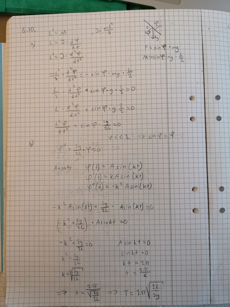a) Bestäm svängningstiden vid små utslag. Använd samma typ av samband som i övning 6.10 (lägger uppgiften samt mina lösningar nedan).