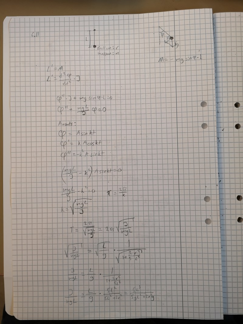 Tror det funkar på detta viset... Enda skillnaden mellan uppgifterna 6.10 och 6.11 är att tröghetsmomentet J är olika. I 6.11 är det ml^2 + 2/5*mr^2. Där 2/5*mr^2 står för klotets tröghetsmoment och där ml^2 står för tröghets momentet från ett föremål som hänger i ett snöre.