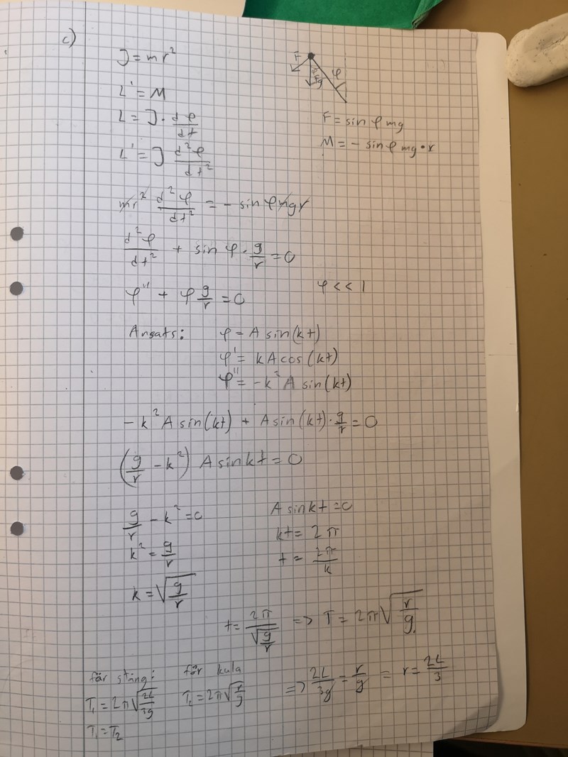 c) Hur lång är en trådpendel med liten kula, som har samma svängningstid.