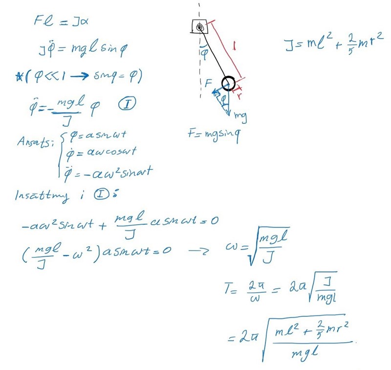 Tröghetsmomentet J map upphängningspunkten ges av m(l + r)2 + 2mr2/5, enligt Steiners sats.