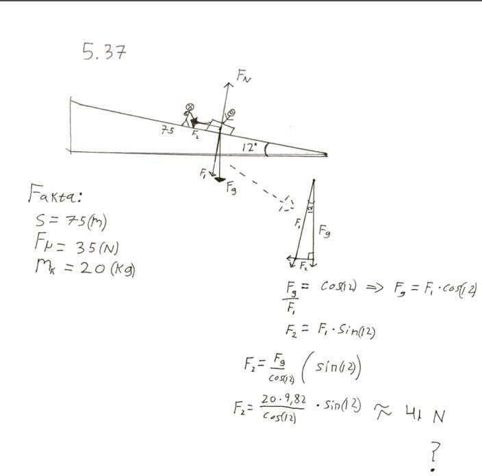 Exakt. Vill bara påpeka att i originaluppgiften fick du lösningen F2 = 20×9,82cos(12)×sin(12) och att den korrekta lösningen är F2 = 20×9,82×sin(12). Det är väldigt liten skillnad i belopp mellan de olika lösningarna men det är resonemanget bakom dem som är viktiga