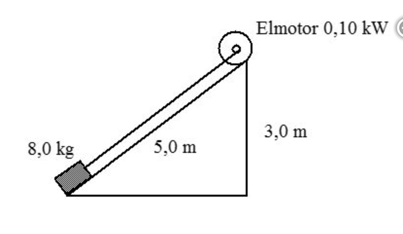En elektrisk motor som tillförs effekten 0,10 kW drar en låda som väger 8,0 kg med konstant fart uppför ett lutande plan till höjden 3,0 m. På lådan verkar en konstant friktionskraft 9,5 N.