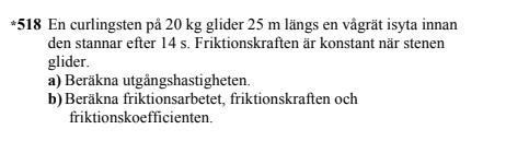 När jag skulle at reda på friktionsarbetet så räknade jag först fram acceleration och fick den till ungefär-3,571...m/s². Jag tänkte att friktionsarbetet verkar på andra hållet och därför bestämde jag att det andra hållet har positiv riktning och därför tänkte att accelerationen skulle bli positiv. Sedan räknade jag fram det genom Wf=Ff*s=20*4,571...*20≈0,13 kJ vilket är det rätta svaret men jag är inte säker på att jag tänkte rätt. Sedan behöver jag hjälp med att räkna friktionskraften och friktionskoefficienten. Hjälp!