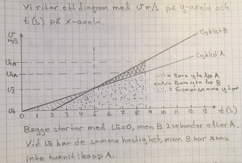 en cyklist A startar från vila och accelererar likformigt. 2s senare startar en annan cyklist B från samma utgångsläge. Även B accelererar likformigt. 5 s efter A:s start har A och B samma hastighet. när hinner B upp A?
