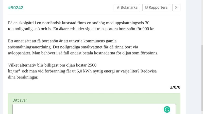 Jag började med pluggakuten idag så jag ber om ursäkt. Jag har börjat med att omvandla den till KWH. Jag använde mig av formen för smältvärme först Qs = ls*m --> 332*10³*30*10³= 1,002*10¹⁰ = 10,02 GJ = 2,7833 GW =2783333 kWh.