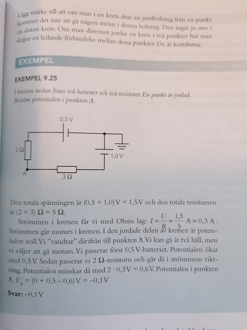 I den jordade delen är potentialen noll. Vi vandrar därifrån till punkten A. Vi kan Går åt två håll men vi väljer att gå moturs. Vi passerar 0.5V batteriet. Potentialen ökar med 0.5V (hänger med på spåret) Sedan passerar vi 2 resistorn och går då i strömmen riktning.