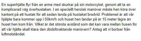 Eftersom du vet tiden det tar att sjunka 15 meter så innebär ju detta att om huset inte står där så missar hen det. Hur långt hinner hjälten färdas i sidled på 1.74 sekunder?