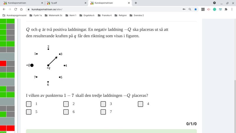 Den kraft som Q utövar på q är en vektor riktad åt höger i bilden. Den kraft som -Q utövar på Q är också en vektor. Åt vilket håll måste den vektorn vara riktad för att summan av de två vektorerna ska vara riktad mot 3?