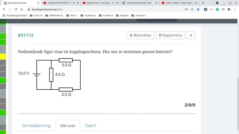 Jag har en fråga angående denna uppgift, hur tolkar man den? Vilka är parallelkopplade och vilka är seriekopplade med varandra. Jag började med att räkna ersättningsresistansen: ((1/2)+(1/4)⁻¹ och sedan svaret som blev --> ((6/5)+(1/4) men det är fel. Förstår ej vilka som är parallel eller serie kopplade här.