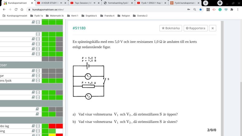 I a-uppgiften flyter ingen ström eftersom strömslingan inte är sluten. Alltså blir I=0 i din formel, och V1 visar därmed 5V.