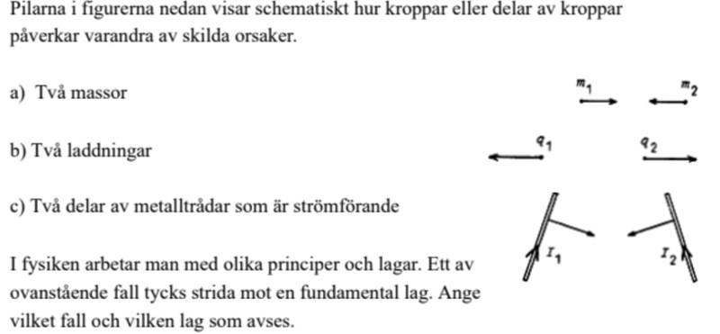 Jag är nästan säker på att det är c, två delar av metalltrådar som är strömförande, är svaret då att det är amperes lag och att strömmarna påverkar varandra med sina magnetfält, jag förstår inte riktigt hur jag ska förklara mer om jag nu tänker rätt
