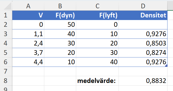 Du får ca 0,928 i två mätningar, men väsentligt lägre densitet vid två andra. Medelvärdet av de fyra mätningarna ligger nära facits värde.