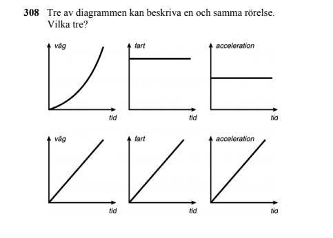 Om accelerationen är konstant (C) ökar farten lika mycket hela tiden (E) och eftersom farten ökar kommer sträckan per tid öka mer än den skulle göra om farten var konstant. D visar hur sträckan förändras vid konstant fart, därför måste det vara A som visar samma rörelse som C och E.