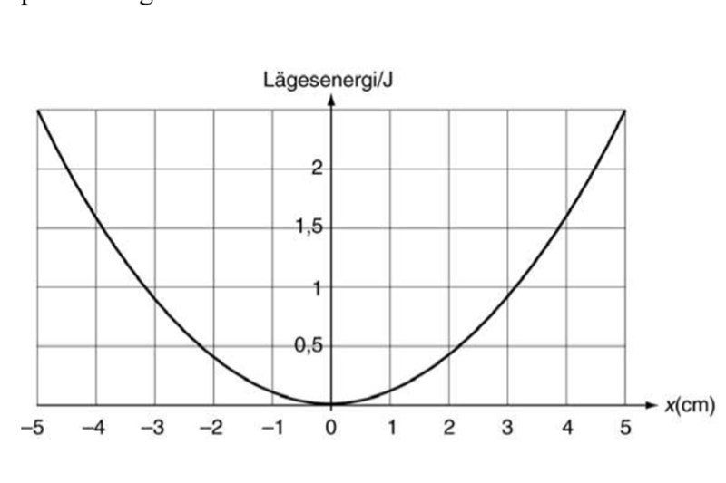 En kula, som är fastsatt i en fjäder, rör sig fram och tillbaka mellan vändlägena -5 cm och 5 cm. Kulans lägesenergi beror av dess läge x som diagrammet visar.