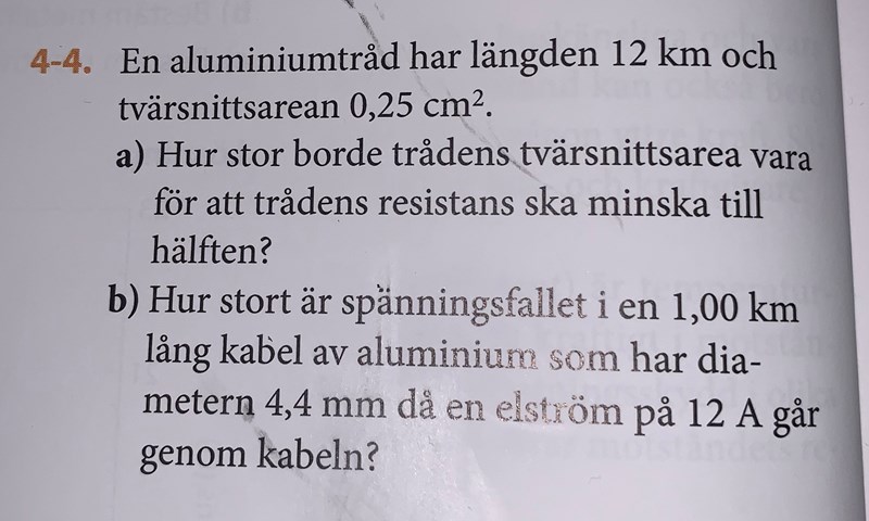 På uppgift b) skulle jag använda samma formel och slå upp aluminiums resistivitet i Maols, funderade nog mest på a) uppgiften.