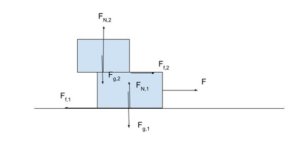 bestämm den högra kraften (ritade det bara som en pil på den nedre klossen). Man hade 2 klossar som låg på varandra, den nedre hade en massa på 500 g och den övre 200 g. Den övre klossen satt också fast i en vägg med nån typ av tråd. Friktionstalet mellan underlaget och undre klossen var 0,20 och mellan klossarna 0,35. Klossarna var u jämvikt. HUR STOR ÄR KRAFT i höger?