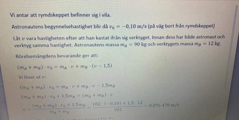 är 15 m när han stöter ifrän sig verktyget?Ah, men det för att vi har att hastigheten är relativt astronautens hastighet v, dvs v-1.5.