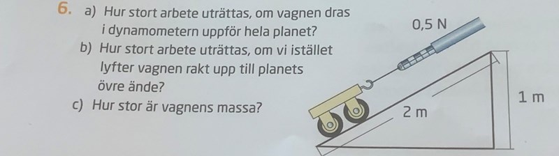 b) Arbetet som utförs på vagnen är lika stort om man drar den uppför ett lutande plan som om man lyfter den rakt upp, så arbetet är...