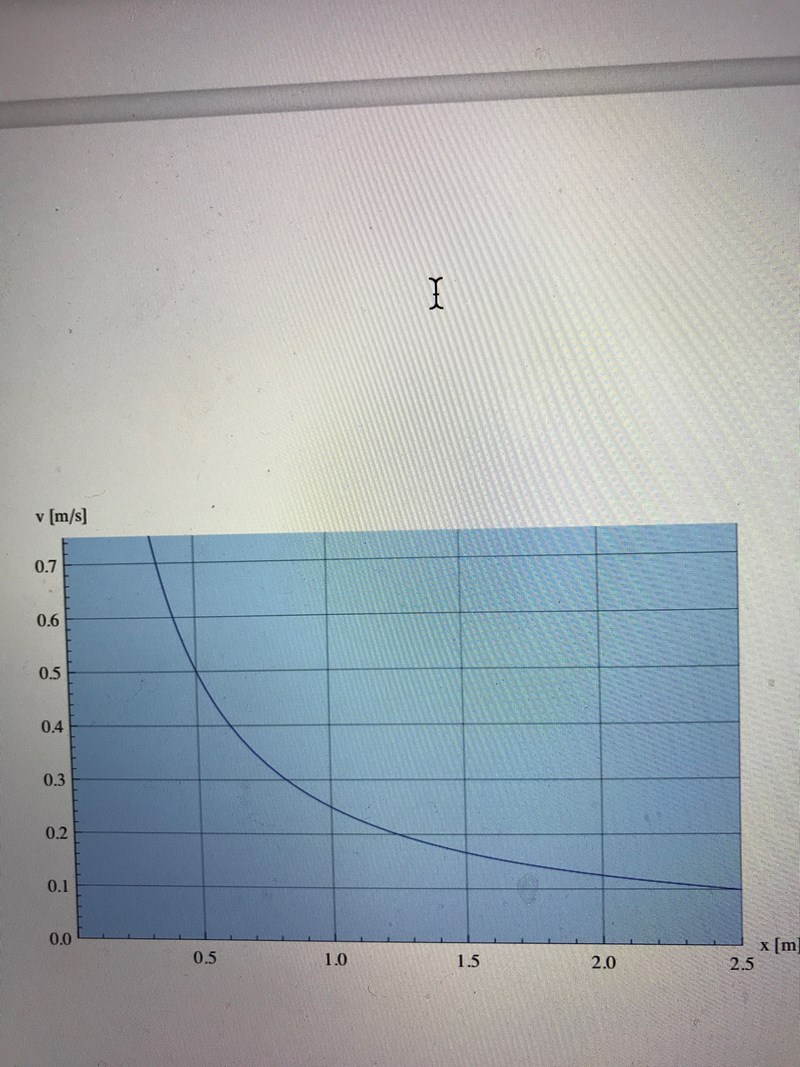 19. Grafen nedan visar hastigheten v(x) som funktion av x-koordinaten för en partikel som rör sig längs en linje. Funktionen är v(x) = k/x, där k är en konstant med vaärdet k = 0.25 m^2/s. Hur lång tid tar det för partikeln att komma från x = 1.0 m till x = 2.0 m?