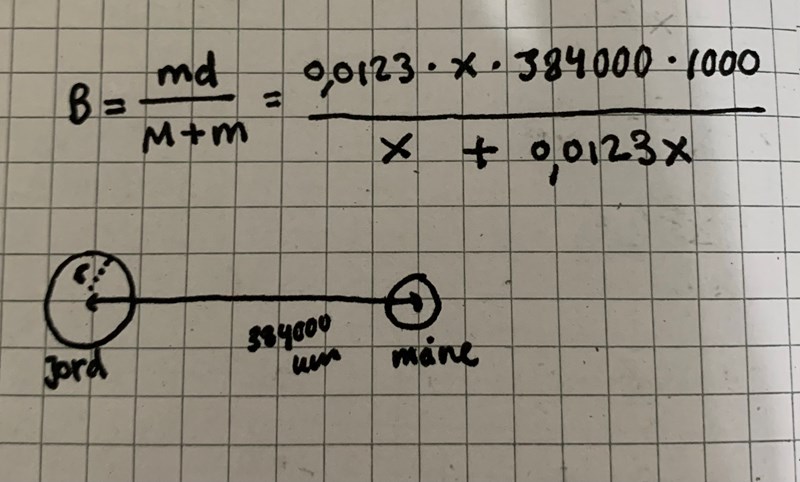 Jag har ritat en figur, jag använde formeln för barycentrum, där x är jordens massa. Jag vet inte vad radien ska användas för