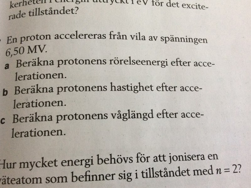 Så man jämför W = qU med viloenergin för respektive partiklar. I detta fall är det en proton ( q^(2)U/938 = 1,77*10^(-34) ) men varför säger facit då att man ska använda relativistisk formel?