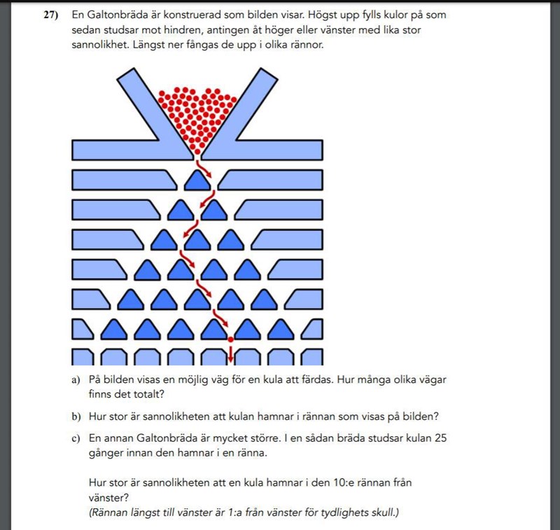 Har löst A där jag fick 64 vägar som kulan kan välja. Detta genom att använda Binomialsatsen som lyder (a+b)^n där n är antalet våningar på Galton brädan och A och B är 1. (1+1)^6=64 detta tror jag i alla fall är rätt.
