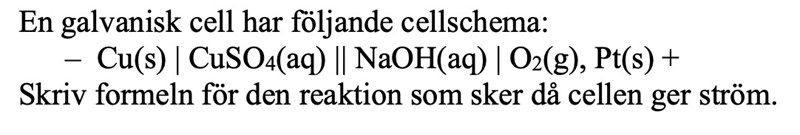 Behöver hjälp med den här uppgiften. Det jag kommit fram till hittills är att eftersom det sker oxidation vid (-) pol och reduktion vid (+) pol så kommer koppar att oxideras. samt syrgas att reduceras, antar att Platina inte deltar i reaktionen eftersom den inte ingår i någon av de ämnen som bildas. Hur ska jag gå vidare?