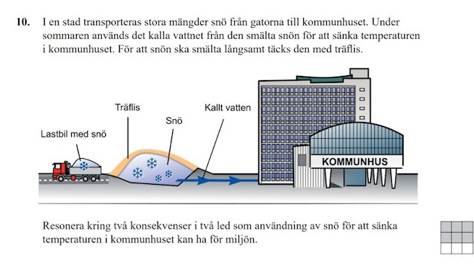 På denna säger bedömningsanvisningen: "Resonemangen kan handla om användning av energi- och naturresurser, ekosystem, transport eller påverkan på växthuseffekten.