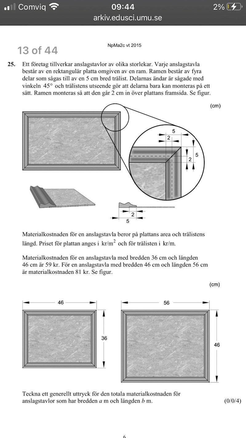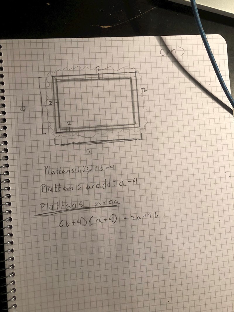 Tänkte jag rätt? Då höjden för den faktiska plattan förminskas med 2 både vid botten och toppen skrev jag (b+4) och samma logik användes för att komma fram till (a+4) och sen tänkte jag bara simpelt vid längden gör trälisten och skrev upp ekvationen för hela anslagstavlans omkrets