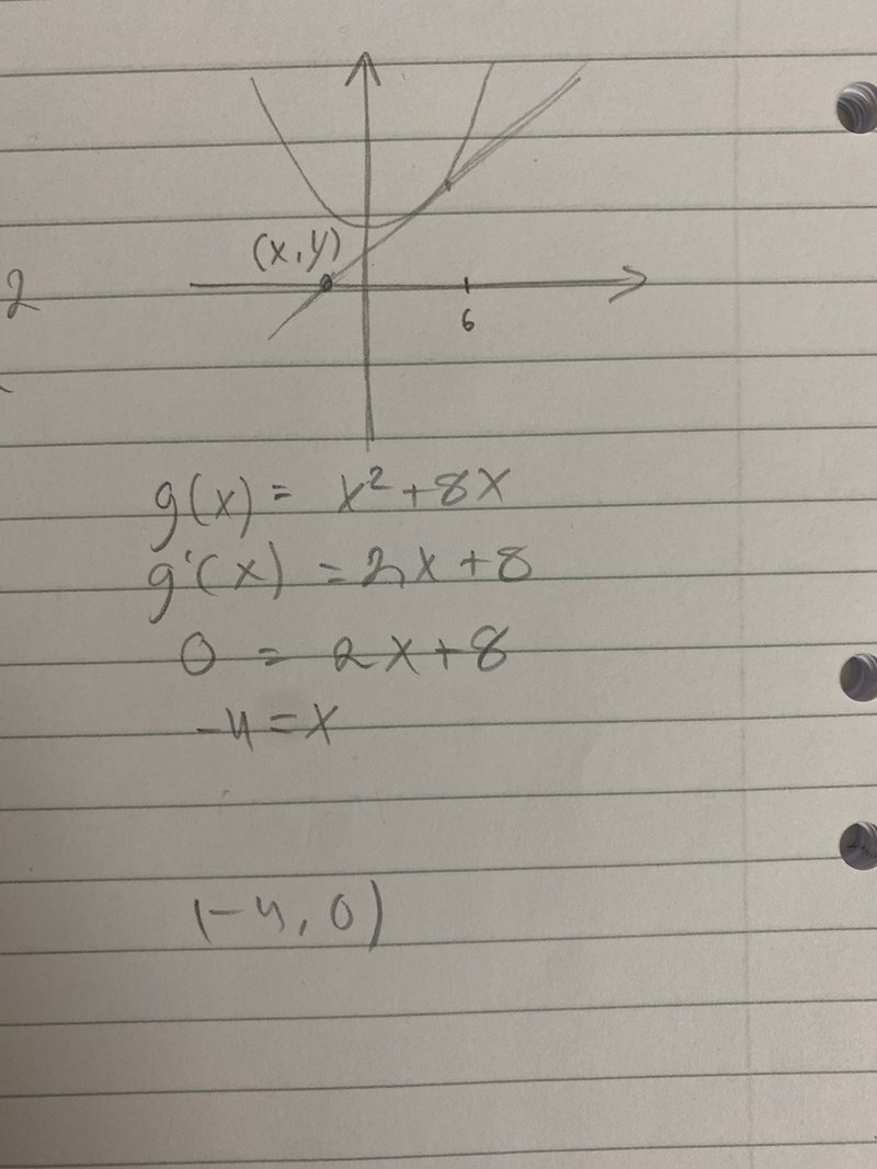 När man sätter in ett x-värde i derivatan får man funktionens lutning och inget annat i den punkten. Derivatan är alltså en funktion som för varje x-värde ger dig funktionens lutning för x-värdet på funktionen. Det du gör när du skriver , är att du löser för vilket x-värde lutningen är 0. Om du testar att plotta g(x) kommer du att dels se att i punkten x=-4 är lutningen noll och dels att det är en minimipunkt.