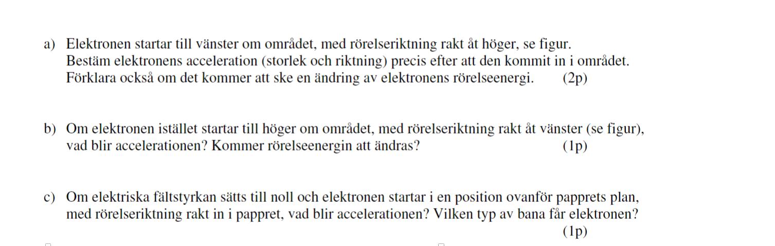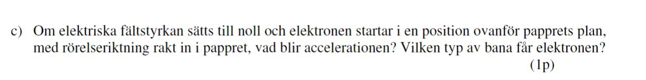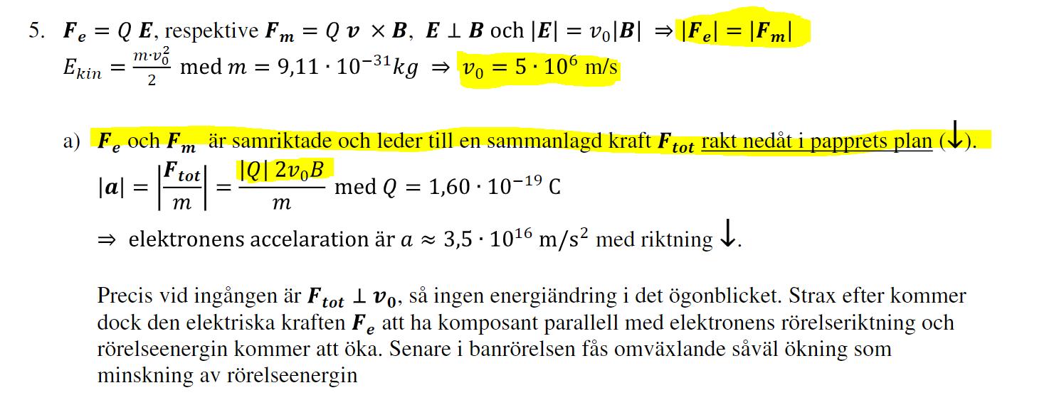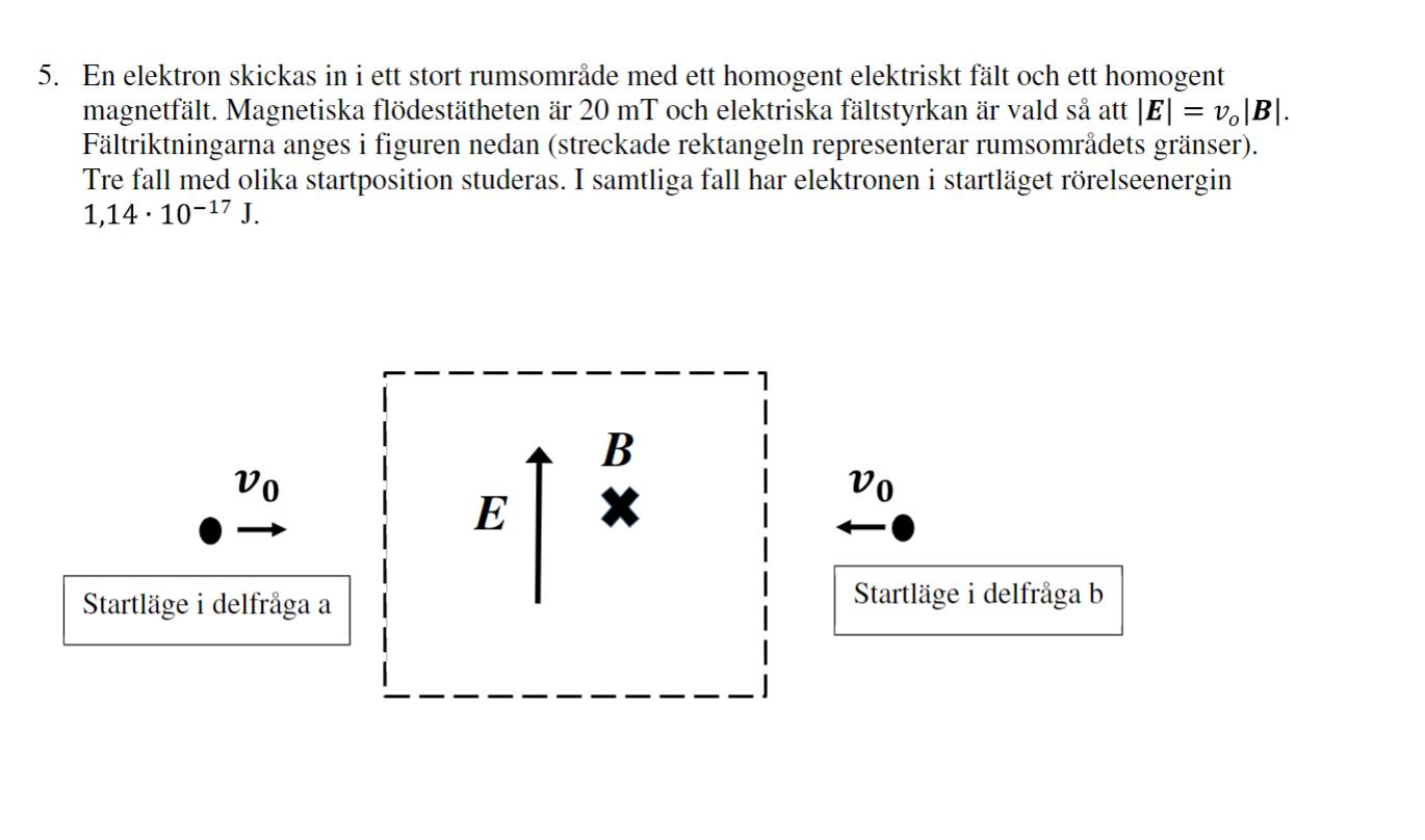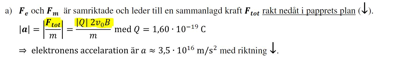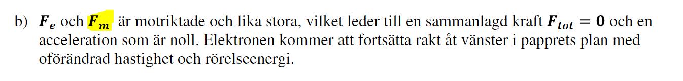 Man har valt att sätta storleken på det elektriska fältet till , det står också i uppgiften. Det innebär att Lorentzkraften får två lika stora komponenter båda riktade åt samma håll vilket vi kan visa enligt följande: