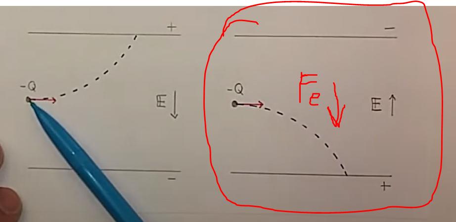 I det här fallet är E-fältet riktat uppåt och vi har en negativ partikel, alltså är riktad nedåt.