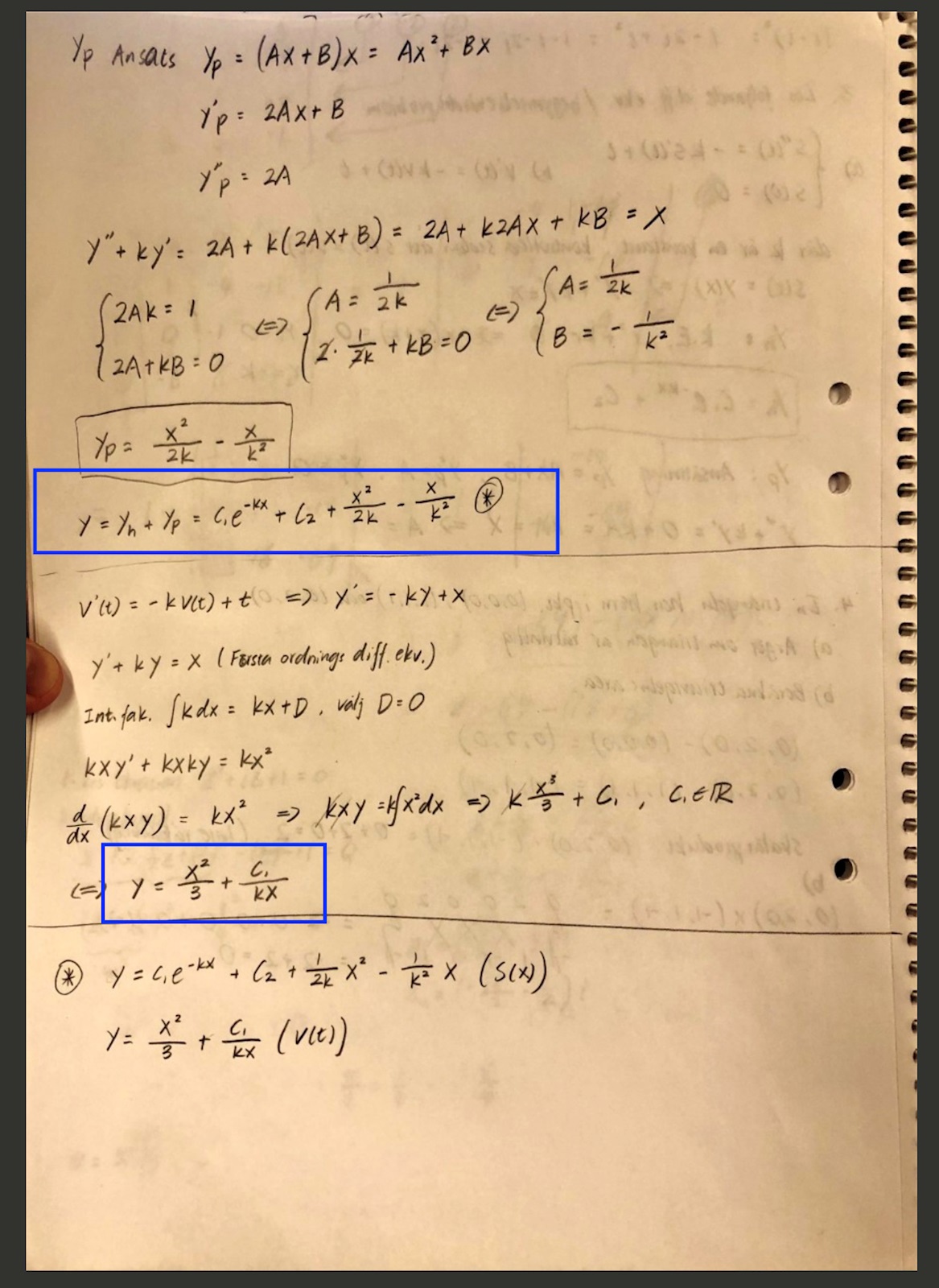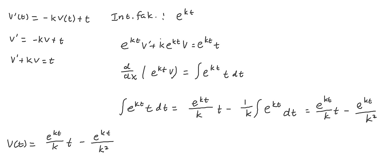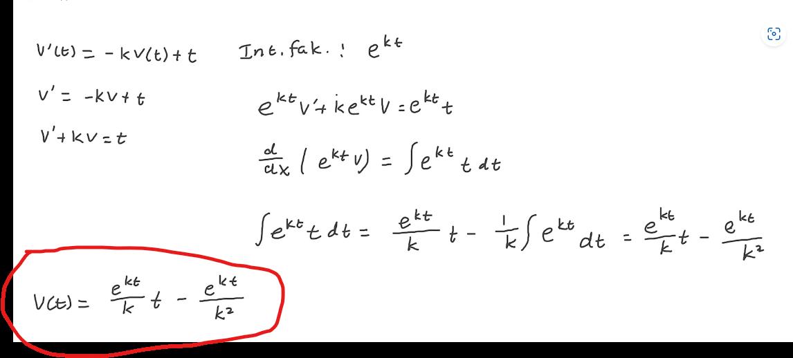 Integralen du beräknat är ju lika med v(t)*e^kt.