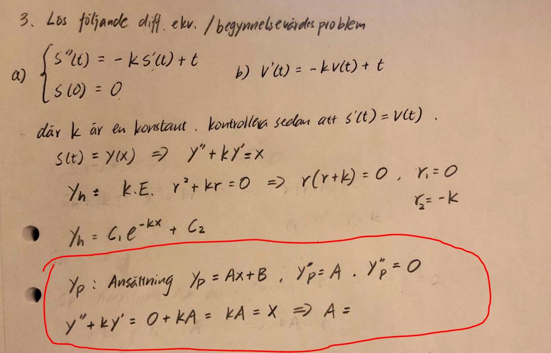 Jag är fastnat med framtagna av den partikulär lösning för s''(t)=-k*s'(t)+t