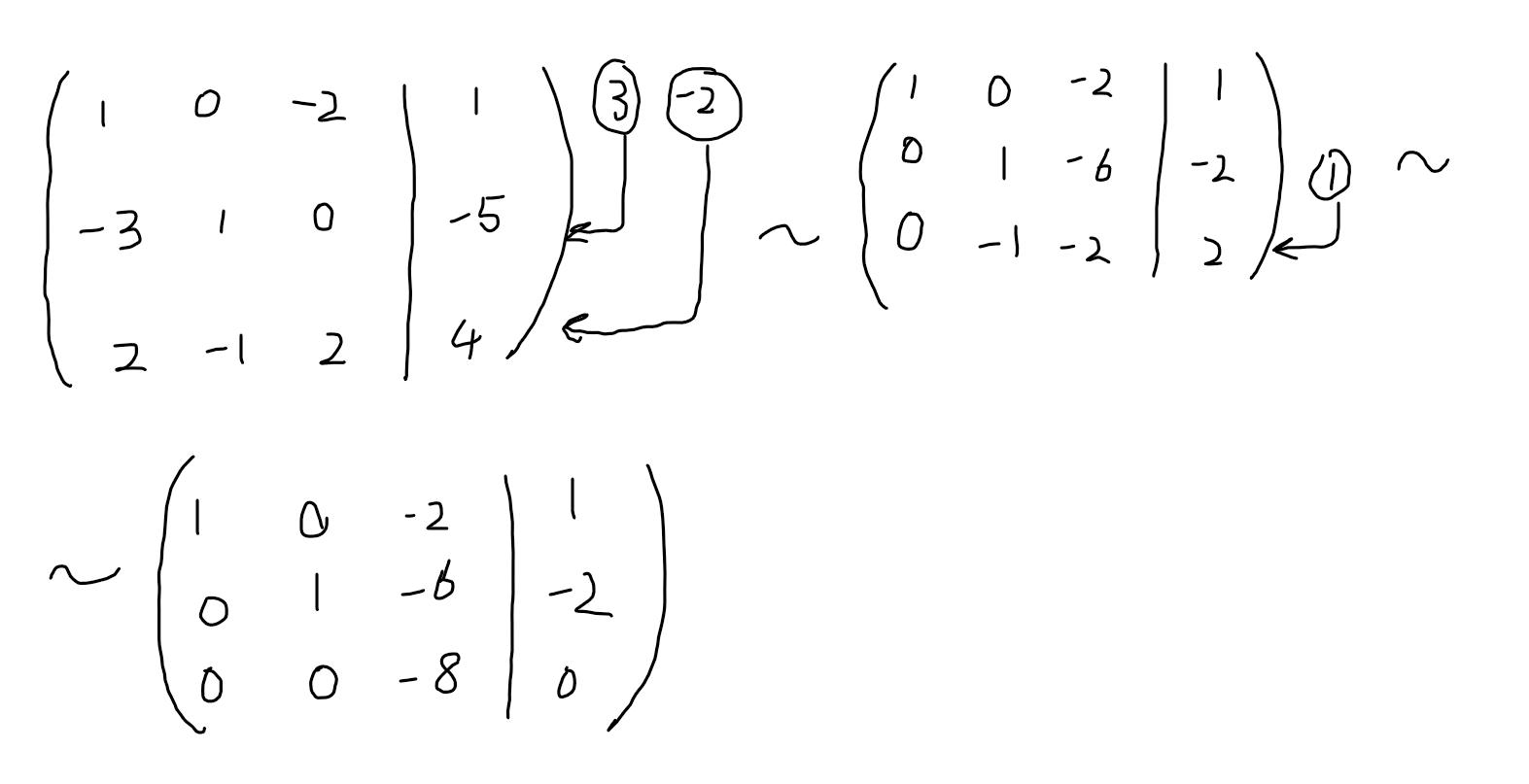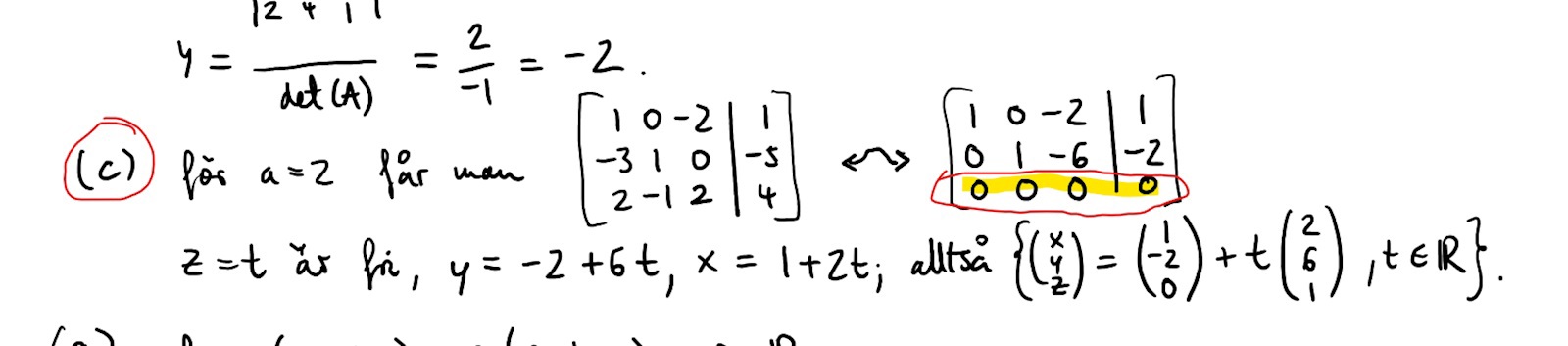Hur blir det när du adderar rad 1 * (-2) till rad tre? :)