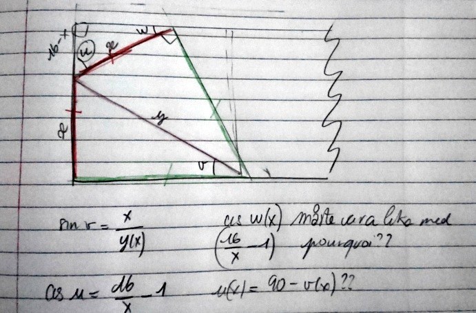 Istället för cosinusvärdet cosu(x) \cos u(x) ska det vara cosinusvärdet cosw(x) \cos w(x) som är lika med (16/x)-1. (16/x)-1. För att det ska kunna bildas trianglar måste talet x x ligga mellan 8 8 och 16 16 , vilket ger cosinusvärden cosw(x) \cos w(x) mellan 0 0 och 1 1 (som det ska vara).