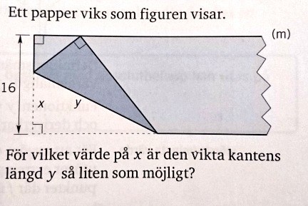 Resultat: Den vikta kanten blir så kort som möjligt om man viker så att x=12 x = 12 . (Det är inte nödvändigt att beräkna hur lång den vikta kanten blir.)