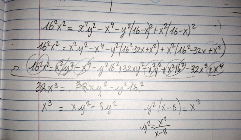 y2=x2+162x232x-162=x2+8x2x-8=x3-8x2+8x2x-8=x3x-8y^2 = x^2 + \frac{16^2 x^2}{32x - 16^2} = x^2 + \frac{8x^2}{x - 8} = \frac{x^3 - 8x^2 + 8x^2}{x - 8} = \frac{x^3}{x - 8}