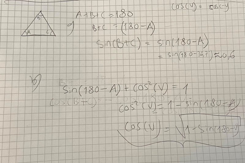 b) jag antar att med V du menar B+C och att du använder trigonometriska ettan där. I så fall har du glömt kvadraten på sin (180 - A)