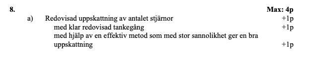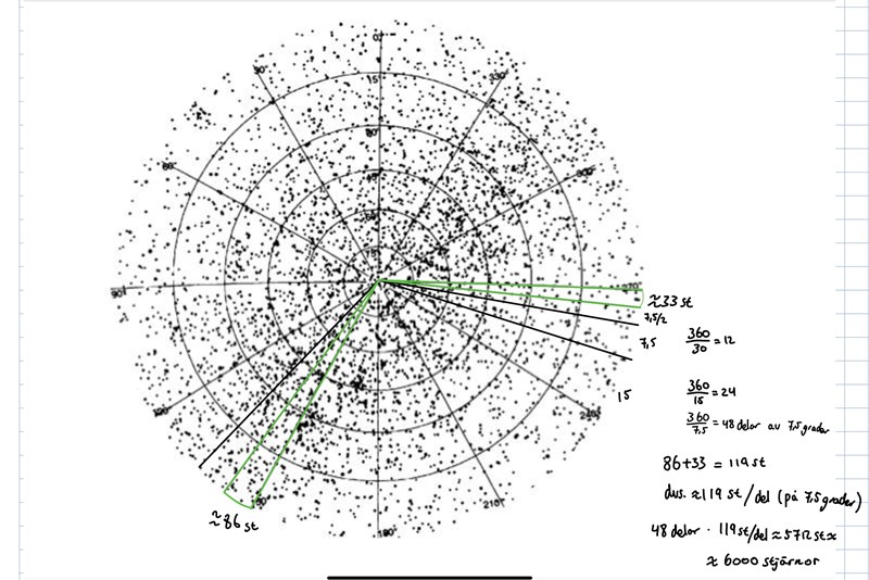 Okej så jag uppskattar att de finns ca 150 st stjärnor per 30 graders "tårtbit" sen kan jag kanske ta det multiplicerat med 12 eftersom hela är 360° och de borde typ bli 1800 och en nackel är att det kanske finns olika många stjärnor i varje tårtbit men en fördel är att det kanske över huvudtaget är möjligt att räkna dem.