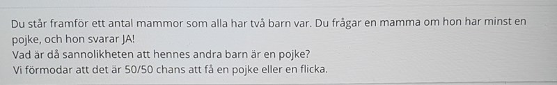 Jag tycker att din lärare har förklarat det på enklast möjliga sätt. Om man har två barn då kan det finnas fyra olika kombinationer: ff, fp, pf och pp. En av dessa består av två pojkar, så sannolikheten att det är två pojkar ä r1/4. Om vi vet att det är åtminstone en pojke, kan vi utesluta kombinationen ff - det finns alltså bara tre möjligheter kvar, och en av dessa är pp, så sannolikheten att det är två pojkar är 1/3.