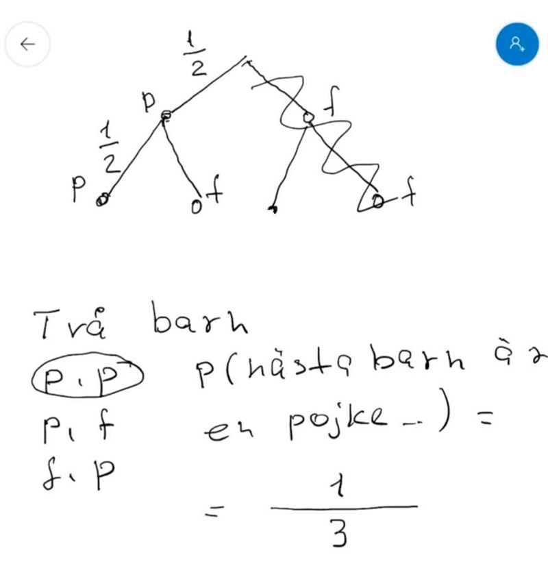 Det är inte min lösning. Det är min lärares. Läraren förklarade det som att man kan ta bort grenen (f, f) för att den är utesluten så som uppgiften är formulerad. Därför finns det bara tre möjliga utfall kvar. (p, p) är det enda gynnsamma utfallet.